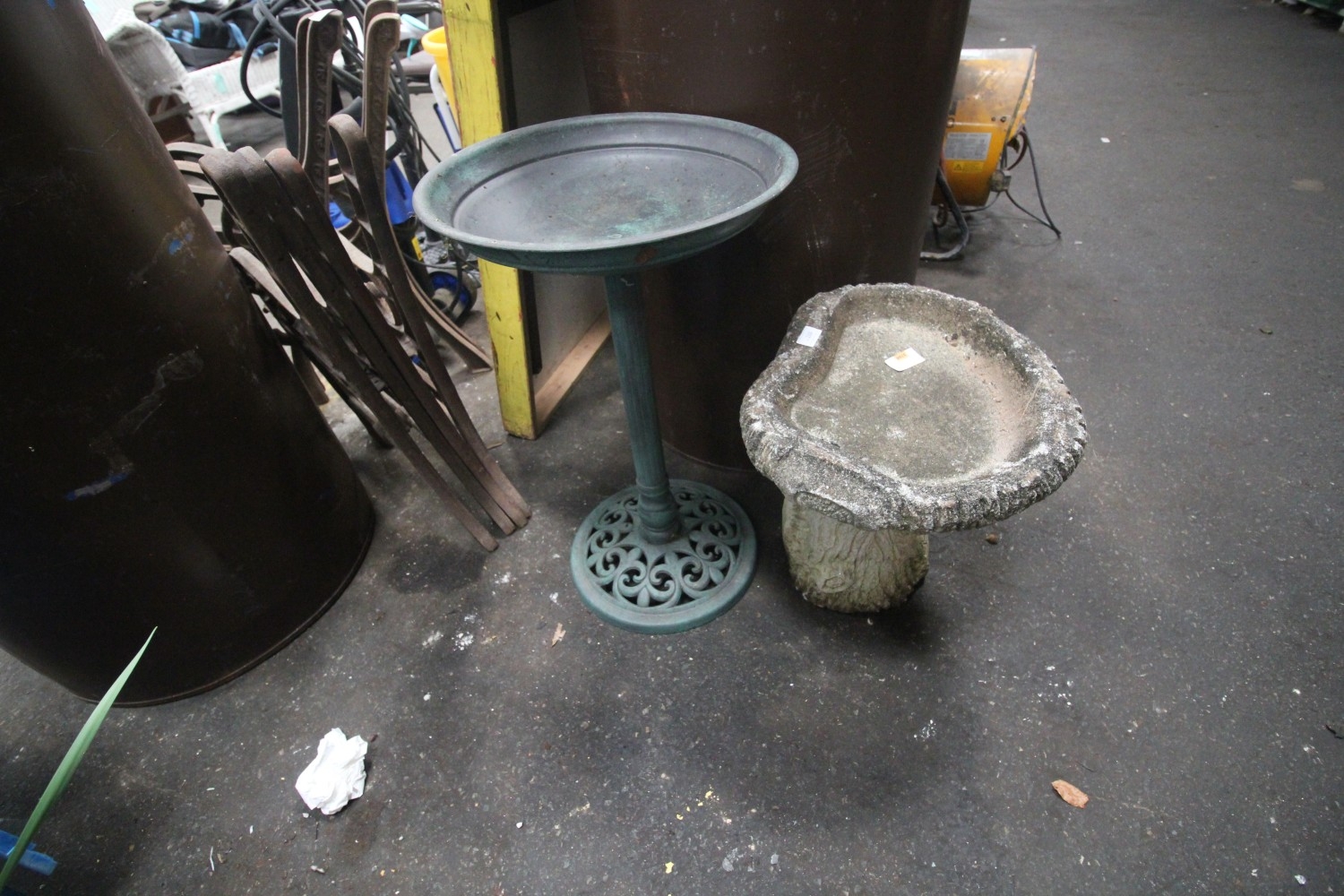 Concrete garden bird bath measuring 40cm in height approx. plus a copper and verdigris effect bird bath measuring 62cm tall approx
