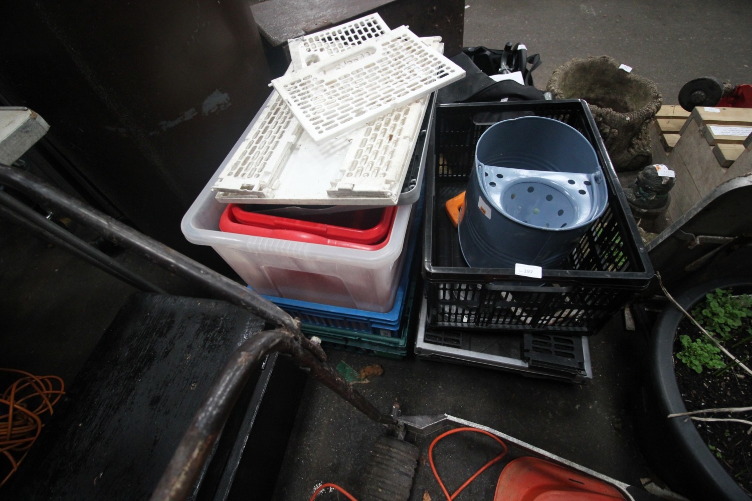 Large quantity of packing crates and a steel mop bucket