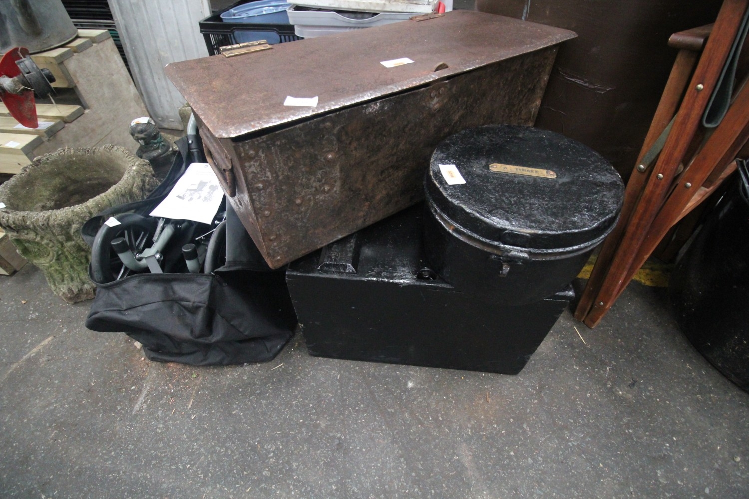 three vintage storage chests – two steel and one timber.