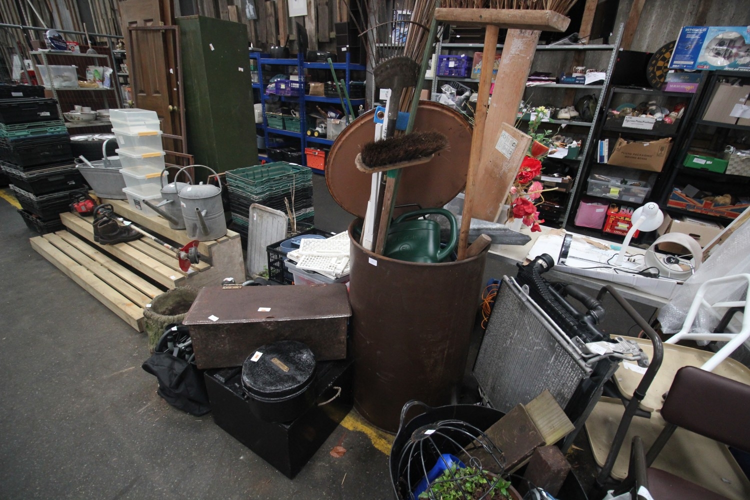 Large steel drum with lid and contents inc bamboo canes, watering can, brooms, leaf rake and more