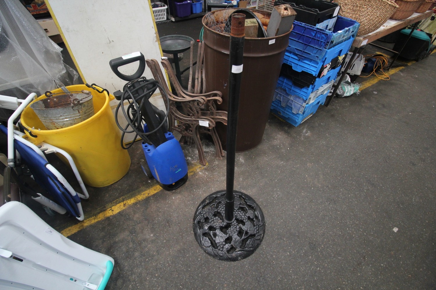 Large cast-iron grape vine themed parasol base and a large yellow bin with contents inc galvanised pail etc