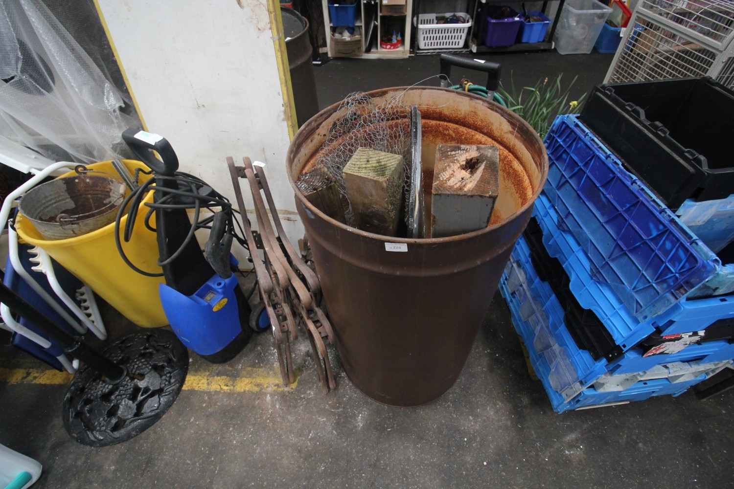 Large clean painted steel drum with lid and contents inc timber pieces, chicken wire etc