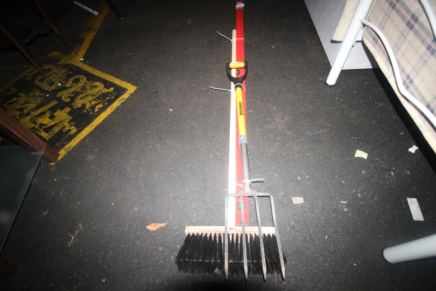 Collection of nearly new tools inc. Kapro 6′ level, Roughneck nylon handled garden fork and new bass broom