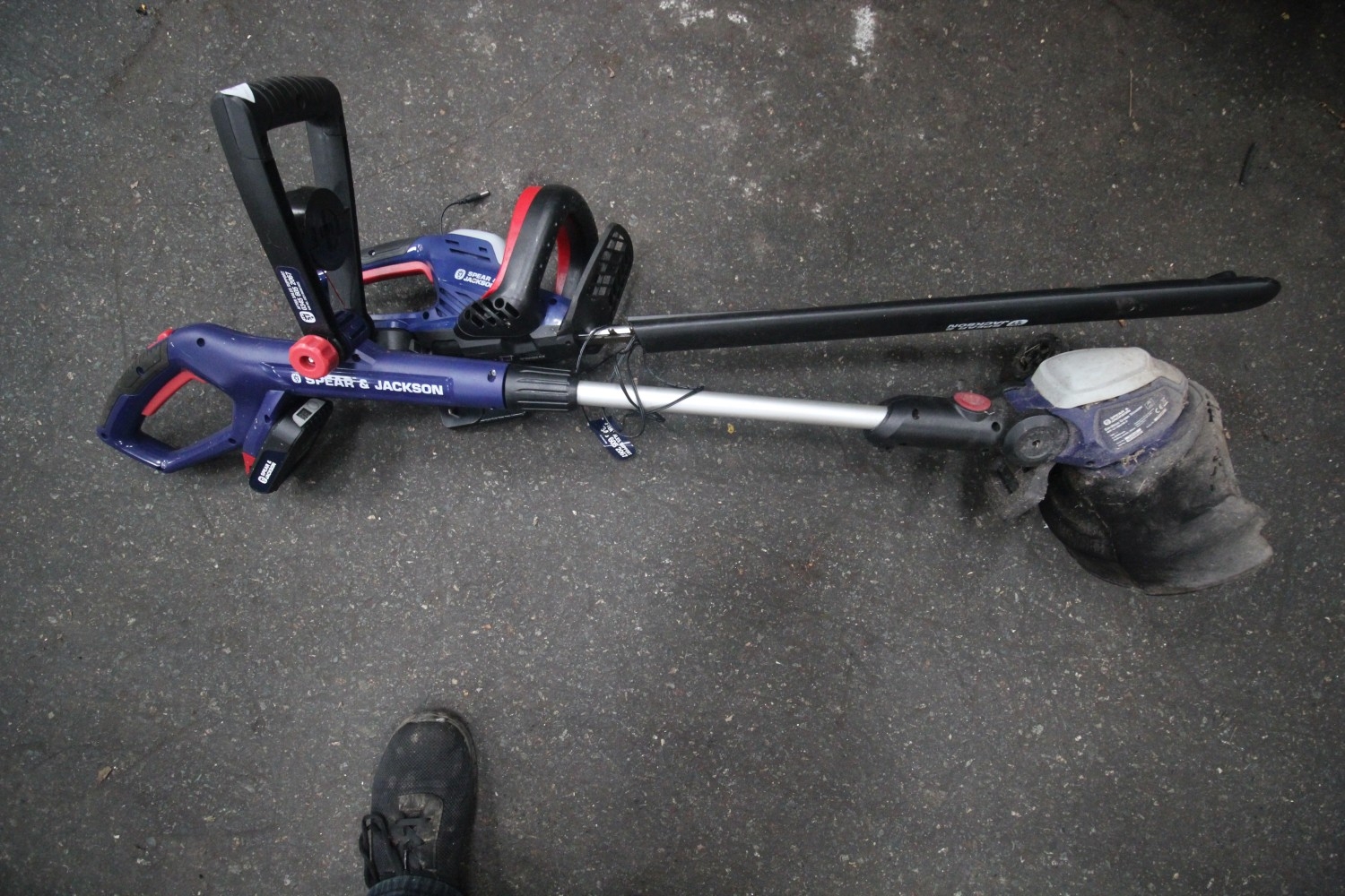 Spear and Jackson cordless hedge trimmer and garden strimmer, complete with batteries and charger