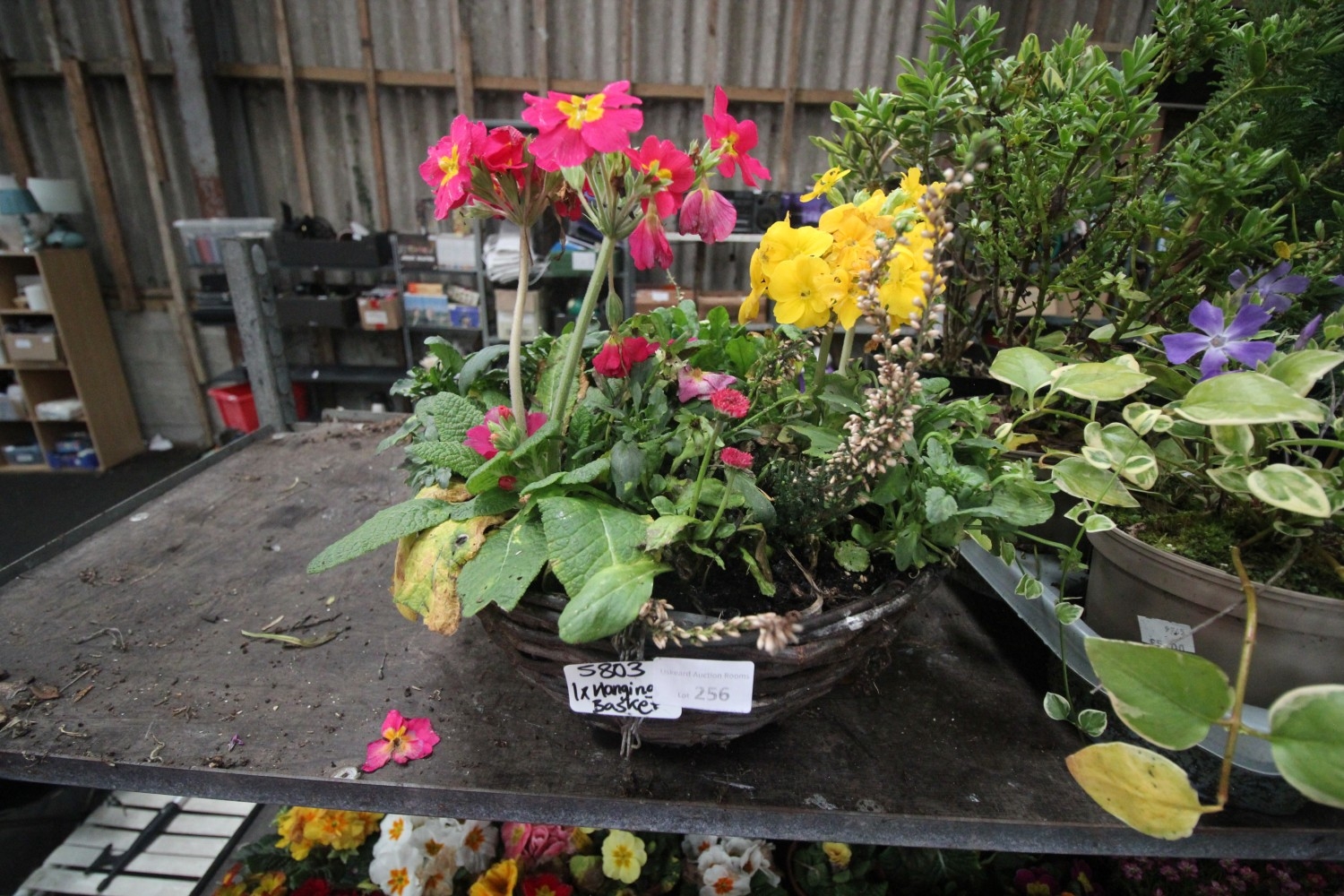 Lot 256: Planted wicker hanging basket with various plants and...