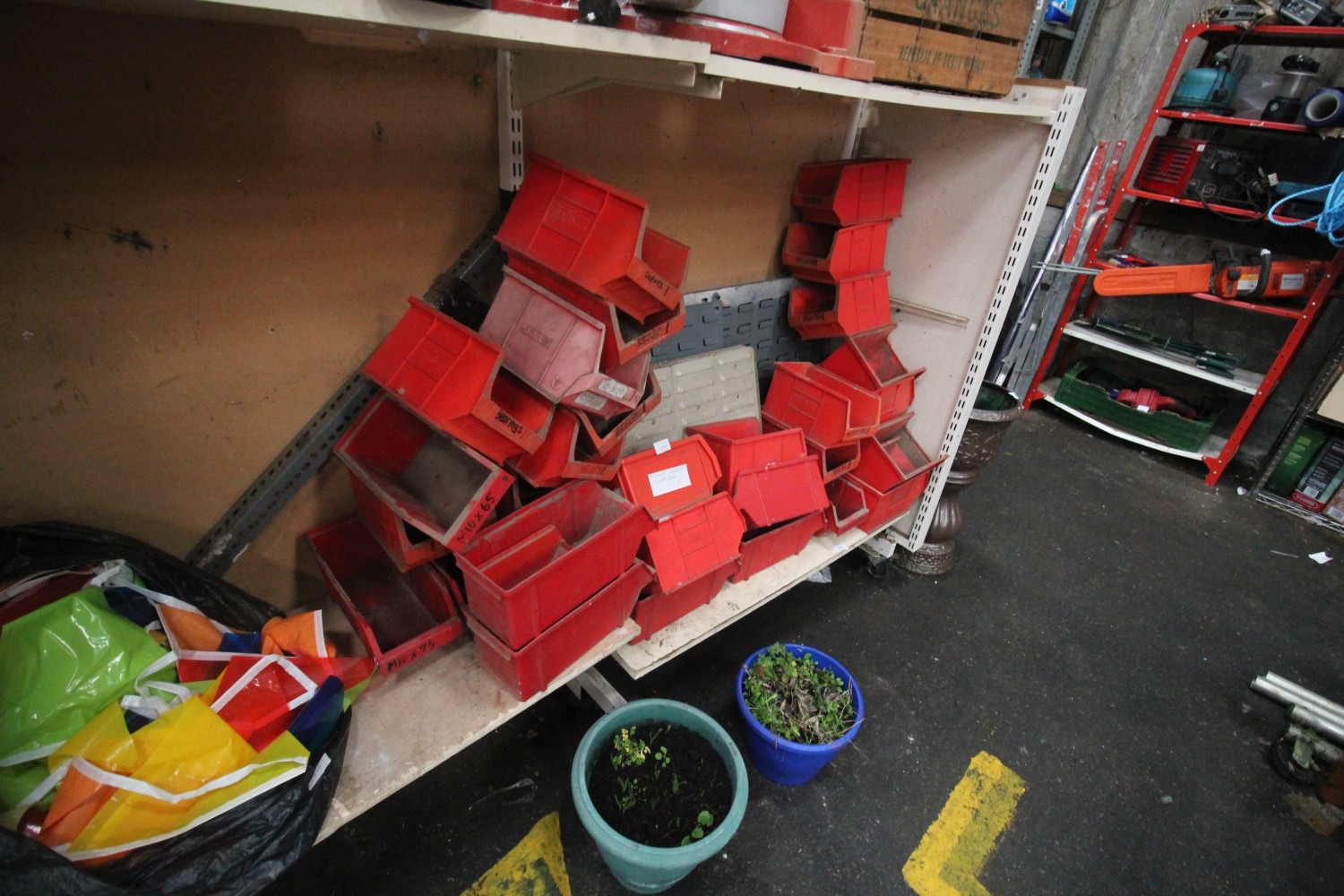 Modular Barton and Link 51 worskshop storage system consisting of sturdy steel wall mounted panels with storage boxes that hook on to the panels. Around 31 storage boxes in total