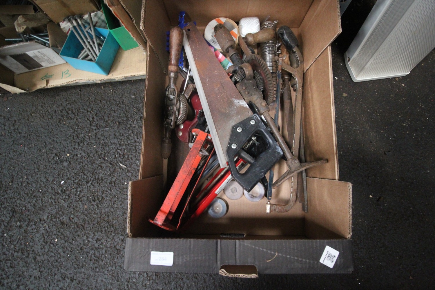 Lot 284: box of mixed tools inc saw, caulking gun...