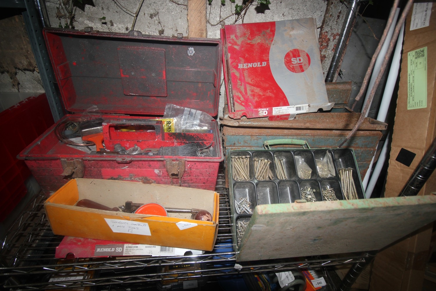 Shelf full of vintage tools inc two cantilevered toolboxes and contents plus a hardware organiser full of different sized screws and a boxed Stanley 803 hand crank drill with side handle and adjustable vintage drill bit