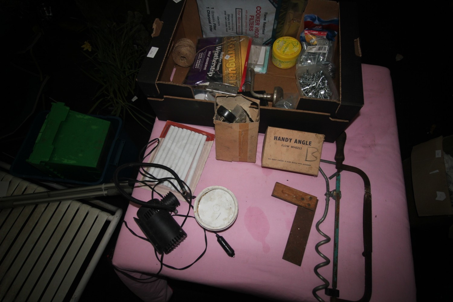 box inc large reel of yarn, cork screw floor fitting, radiator pipes, draper right angle