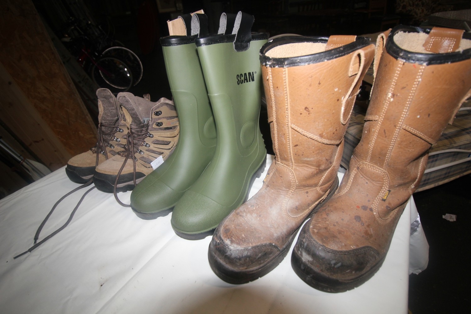 Two pairs of safety footware inc almost brand new pair of size 10 safety wellies by Scan, plus a pair of size 8 Site rigger boots and a pair of size 8 Karrimor hiking boots