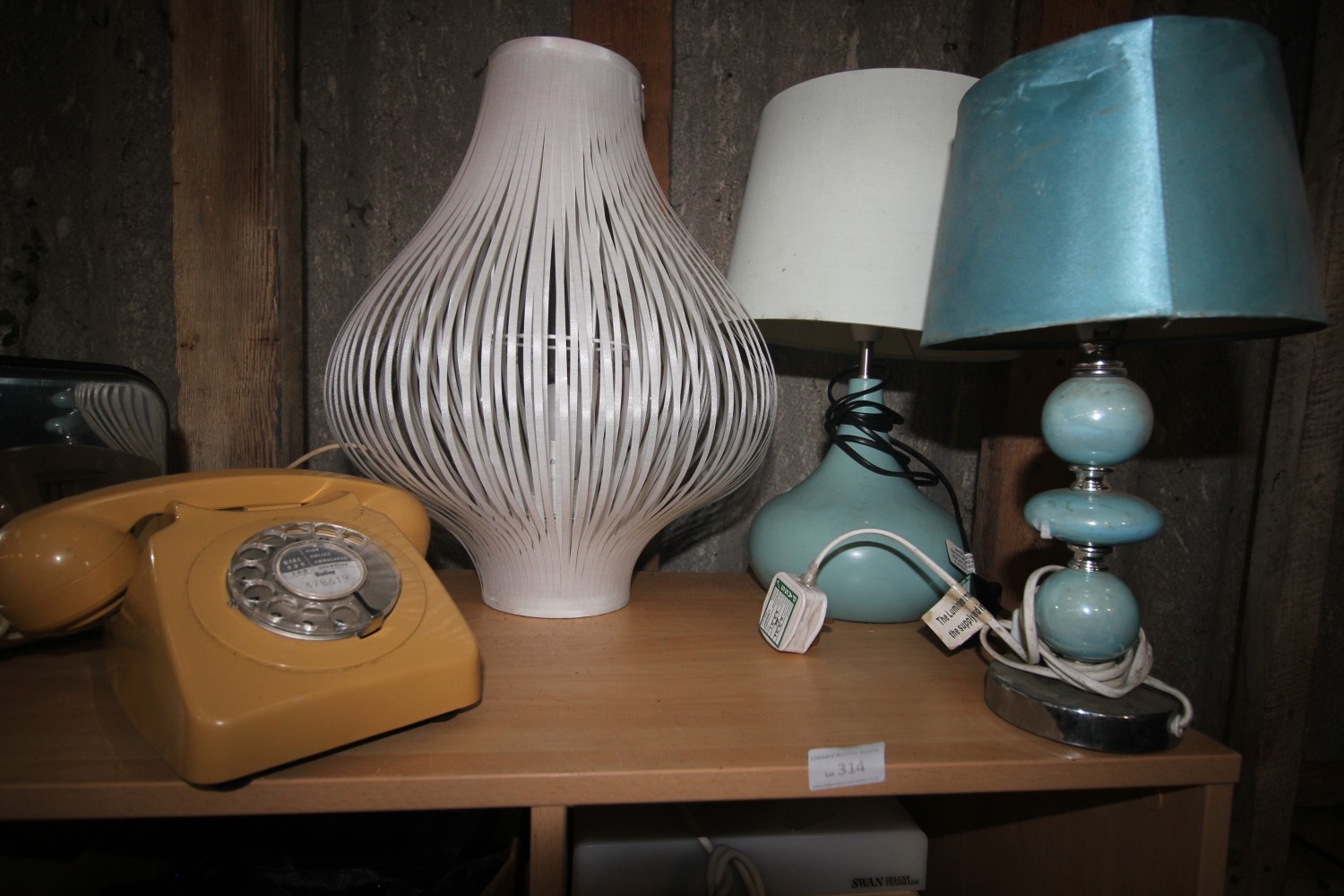 2 blue lamps with decorative bases, white decorative lamp shade and vintage phone