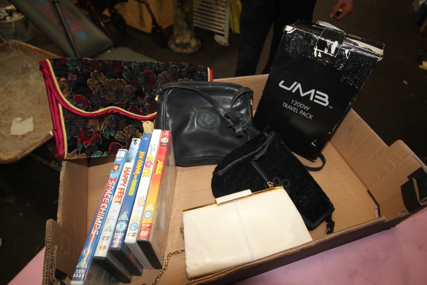 a selection of mixed items inc a travle hair dryer with diffuser attachment many dvd’s and a selection of handbags