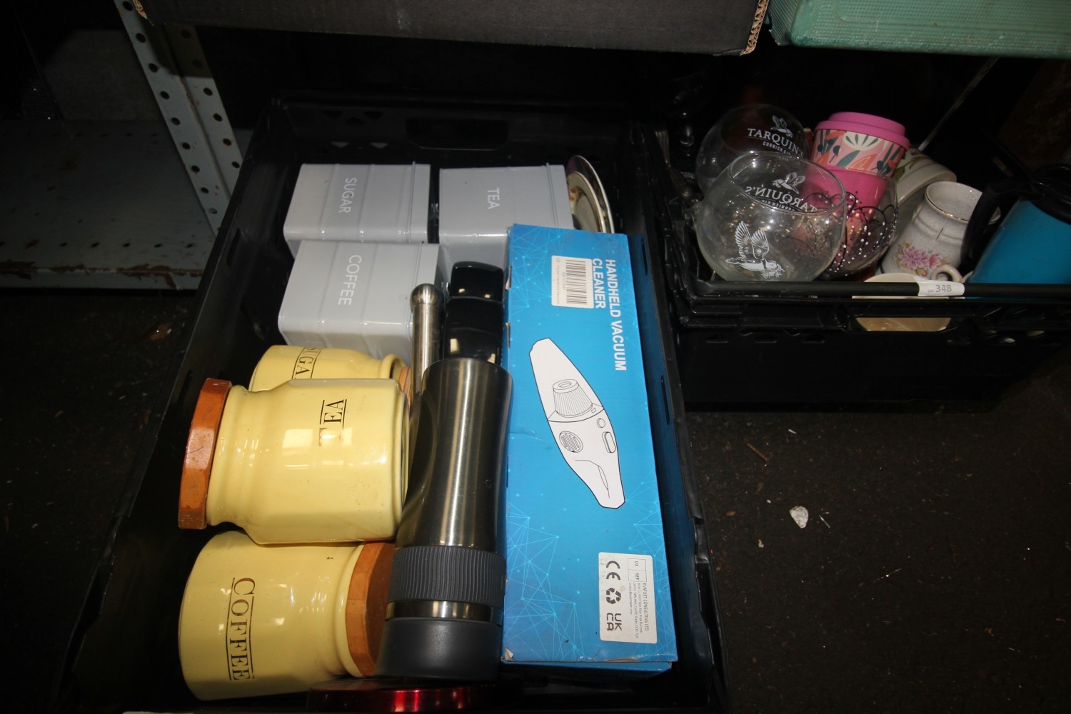 a mixed box of items inc tea coffee and sugar pots hand held vacuum cleaneretc