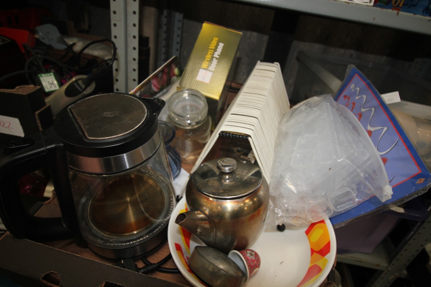 box of misc inc wireless door phone, glass kettle, bulk selection of small pots and more
