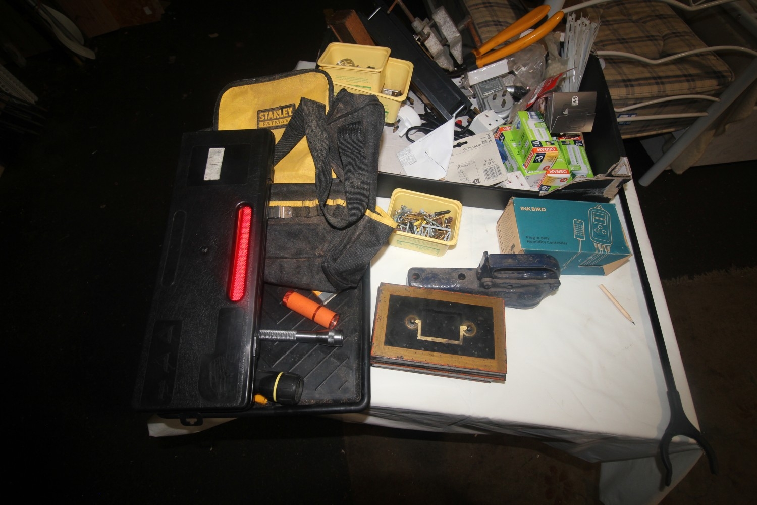 Large box of tools and hardware inc Stanley tool-bag, garden shears, secateurs, torches, backboxes, Inkbird IHC Plug-n-Play Humidity Controller and more