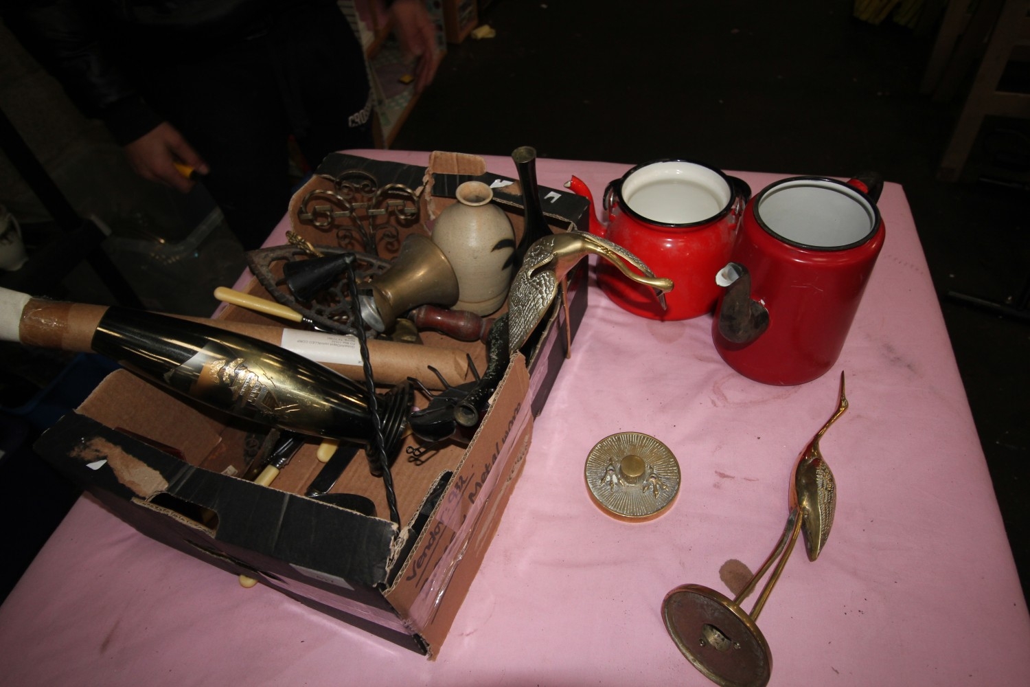 box of mixed collectebles and aintquies inc two red and blsck psinted teapots a selection of brass herron and more