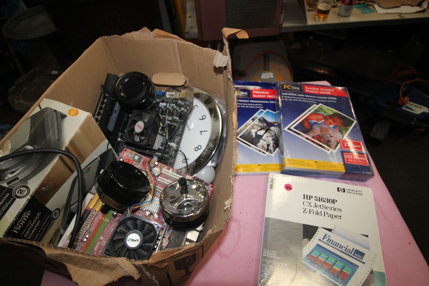 box selection of items inc a sandwich toaster a 5 port tp link quantity of photo paper and more