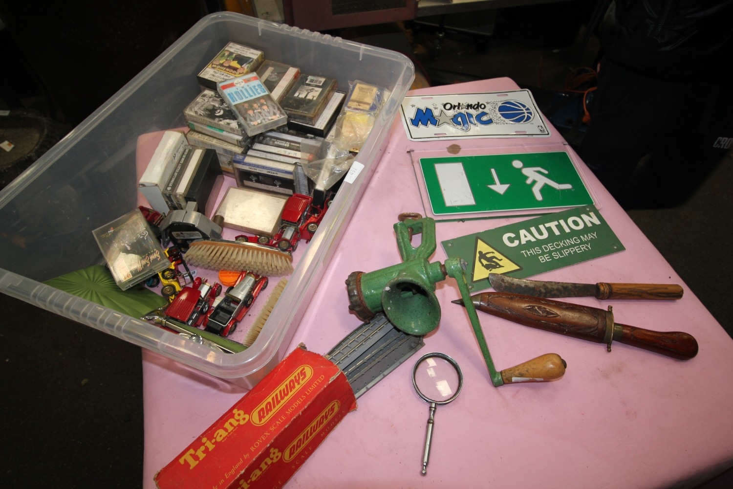 box inc wall plaques a selection of cessete tape and heavy duty meat grinder and a vintage vanity set