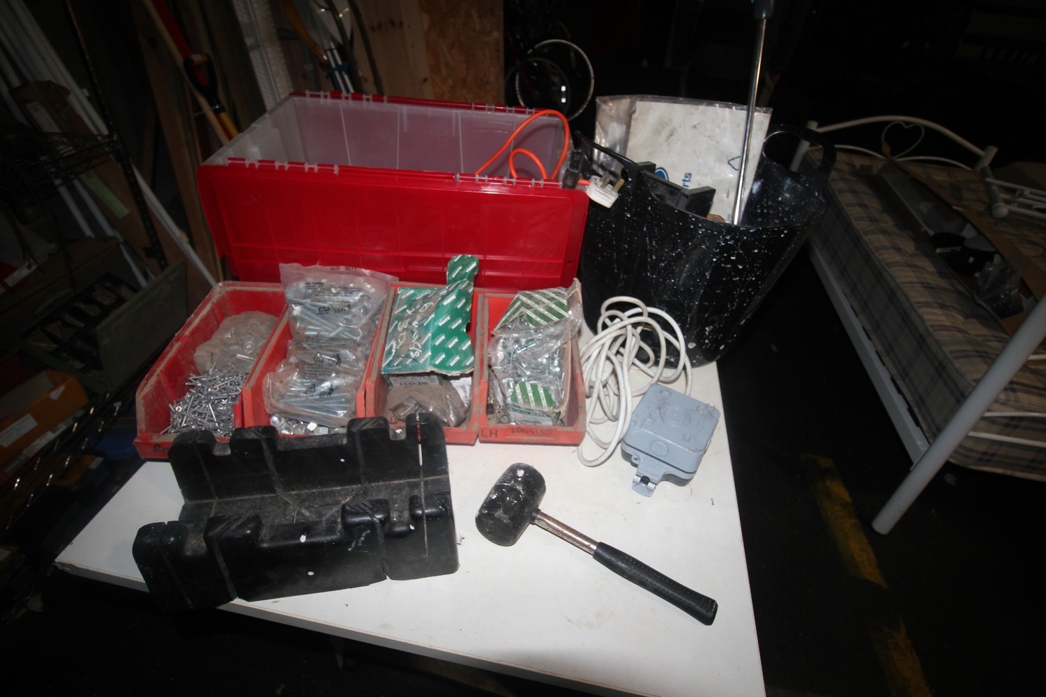 Shelf of misc. hardware and tools inc extension lead, mitre blocks, paint rollers, rubber mallet, safety goggles, many new and boxed bolts, rivets and more