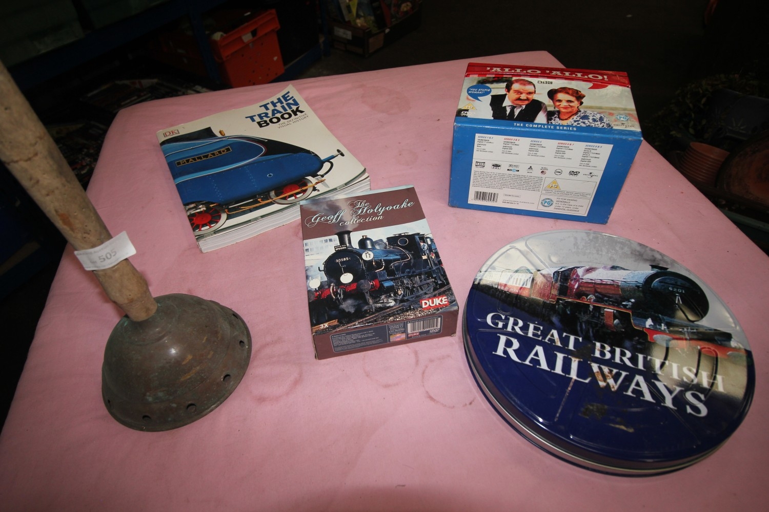 shelf full of items inc the train book,cooper victorian wash dolly and allo allo the complete series