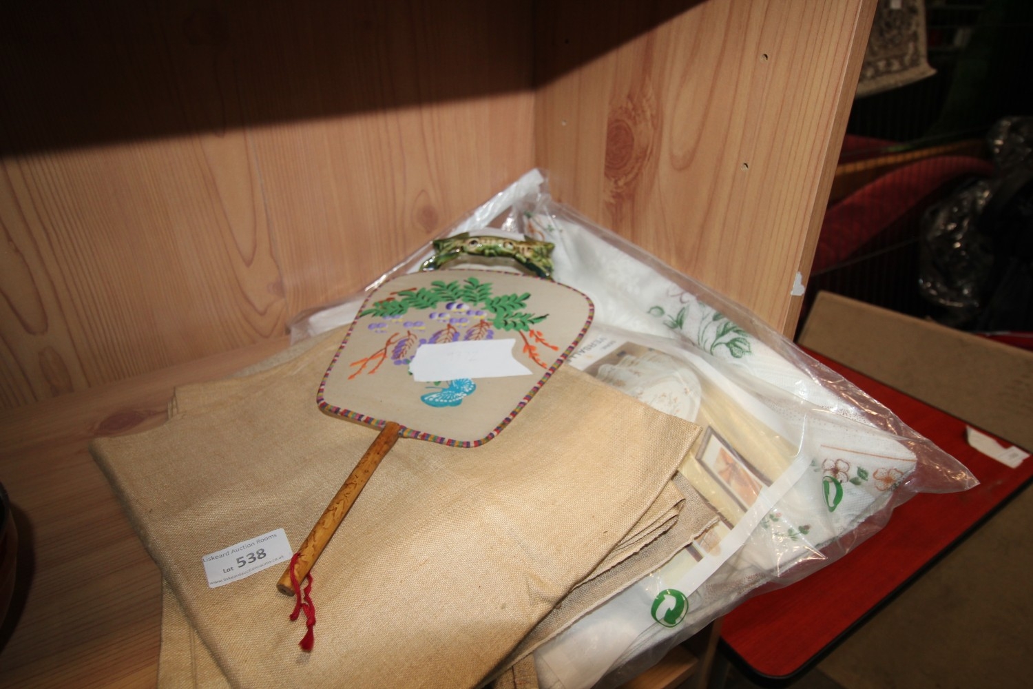 Lot 538: selection of textiles inc table cloth, hand fan...