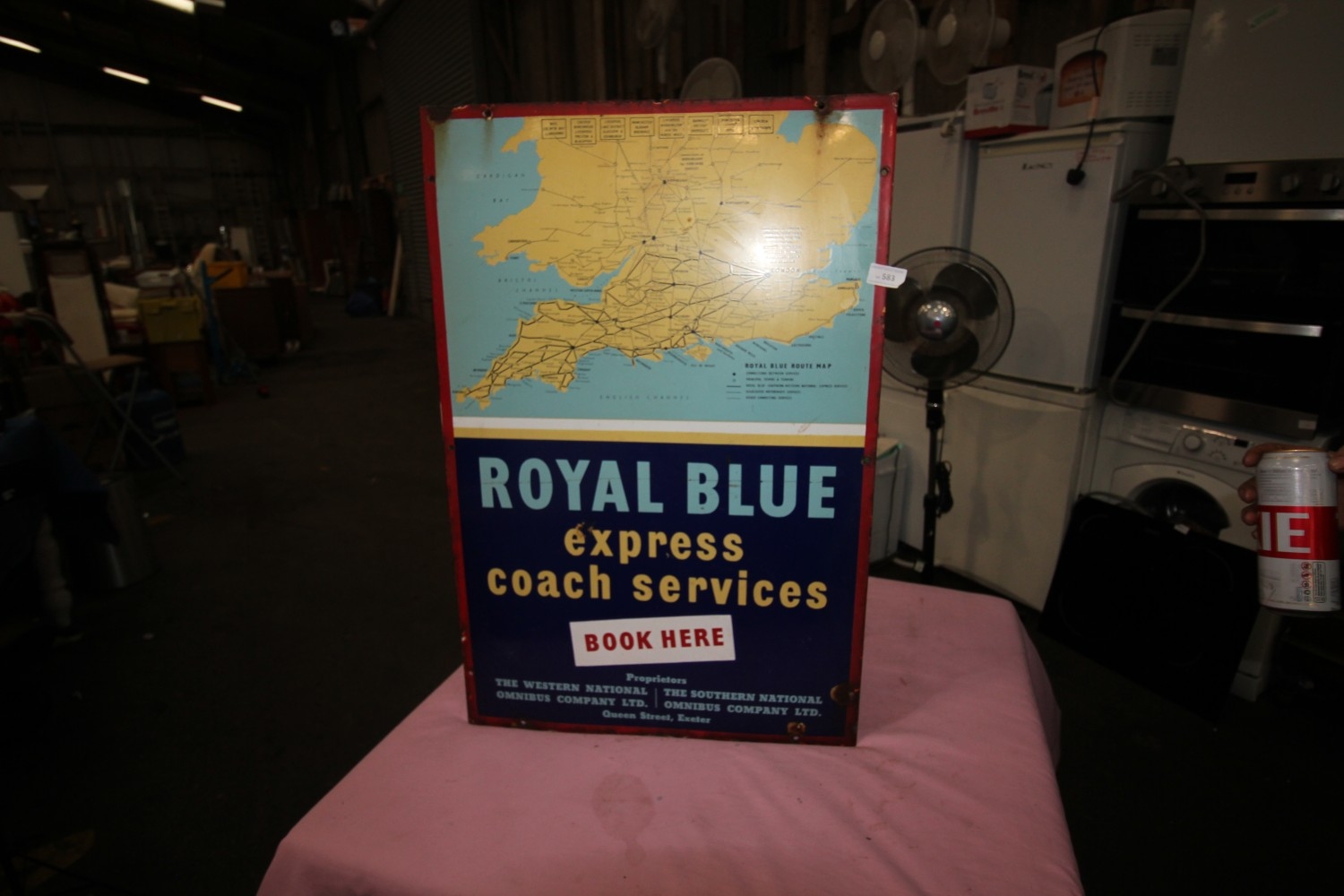 vintage enamel royal blue express coach services sign measuring 30" x 20"