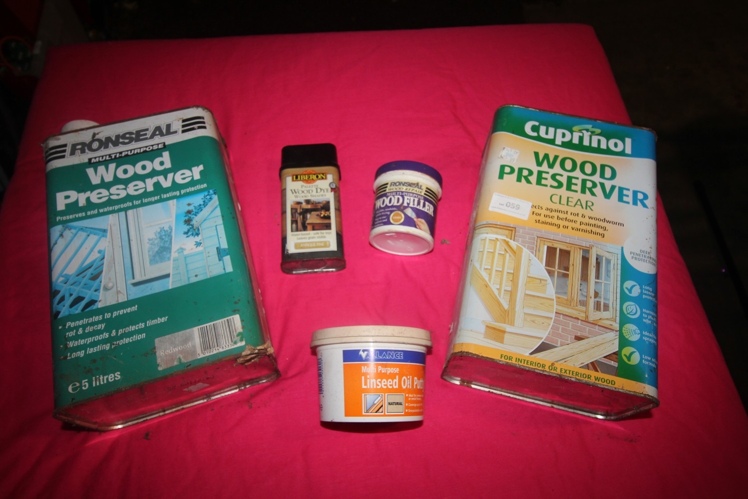 2 large tins of wood preserver plus wood filler and linseed oil putty
