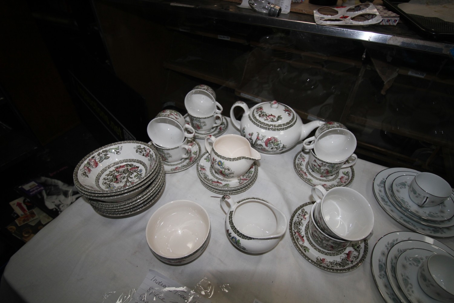 indian tree white 8 piece tea set never used – tea pot, milk jug, cream jug, sugar bowl, 8 each of cups, saucers and bowls.