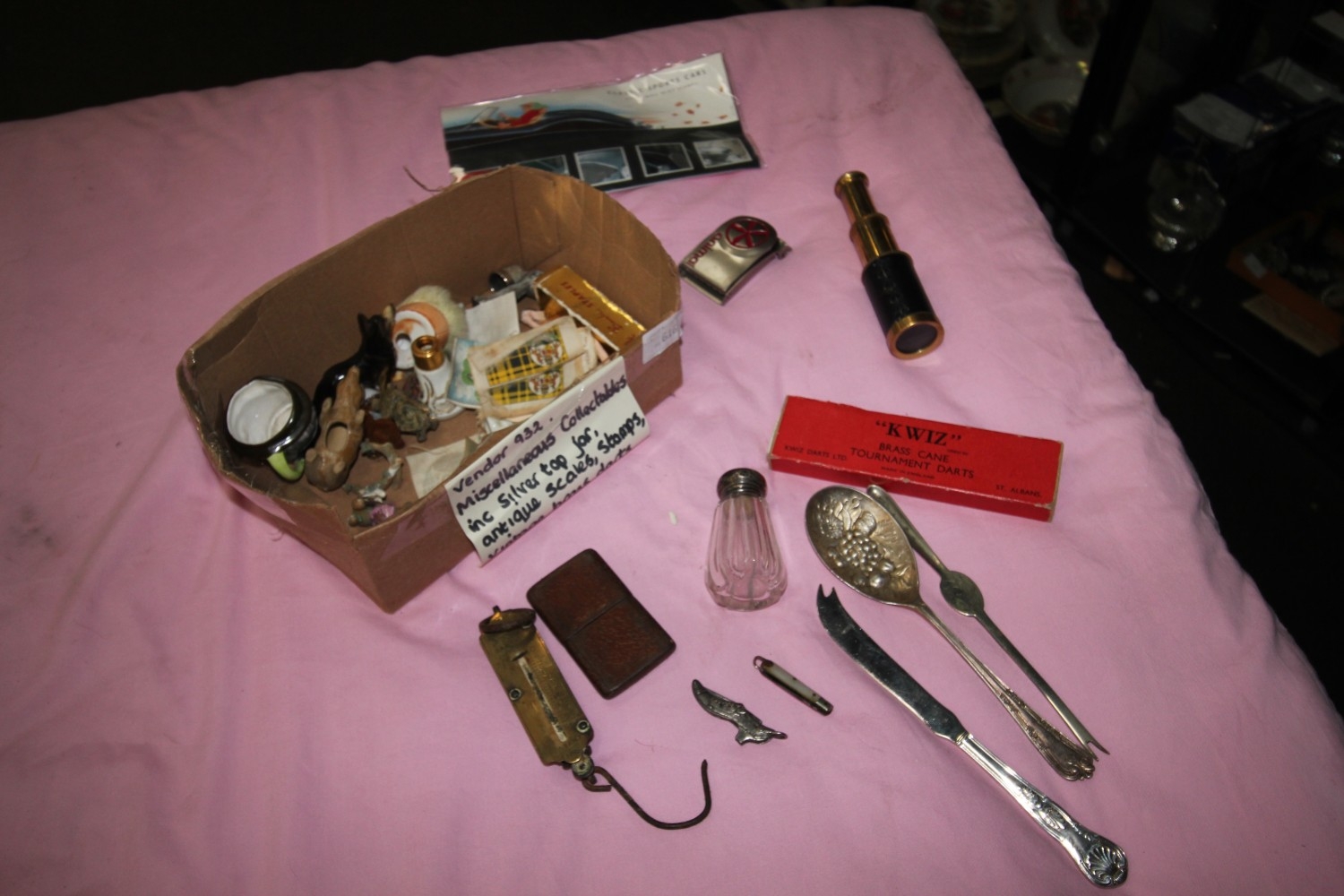 miscellaneous collectables inc silver top jar, antique scales, stamps, vintage brass darts etc