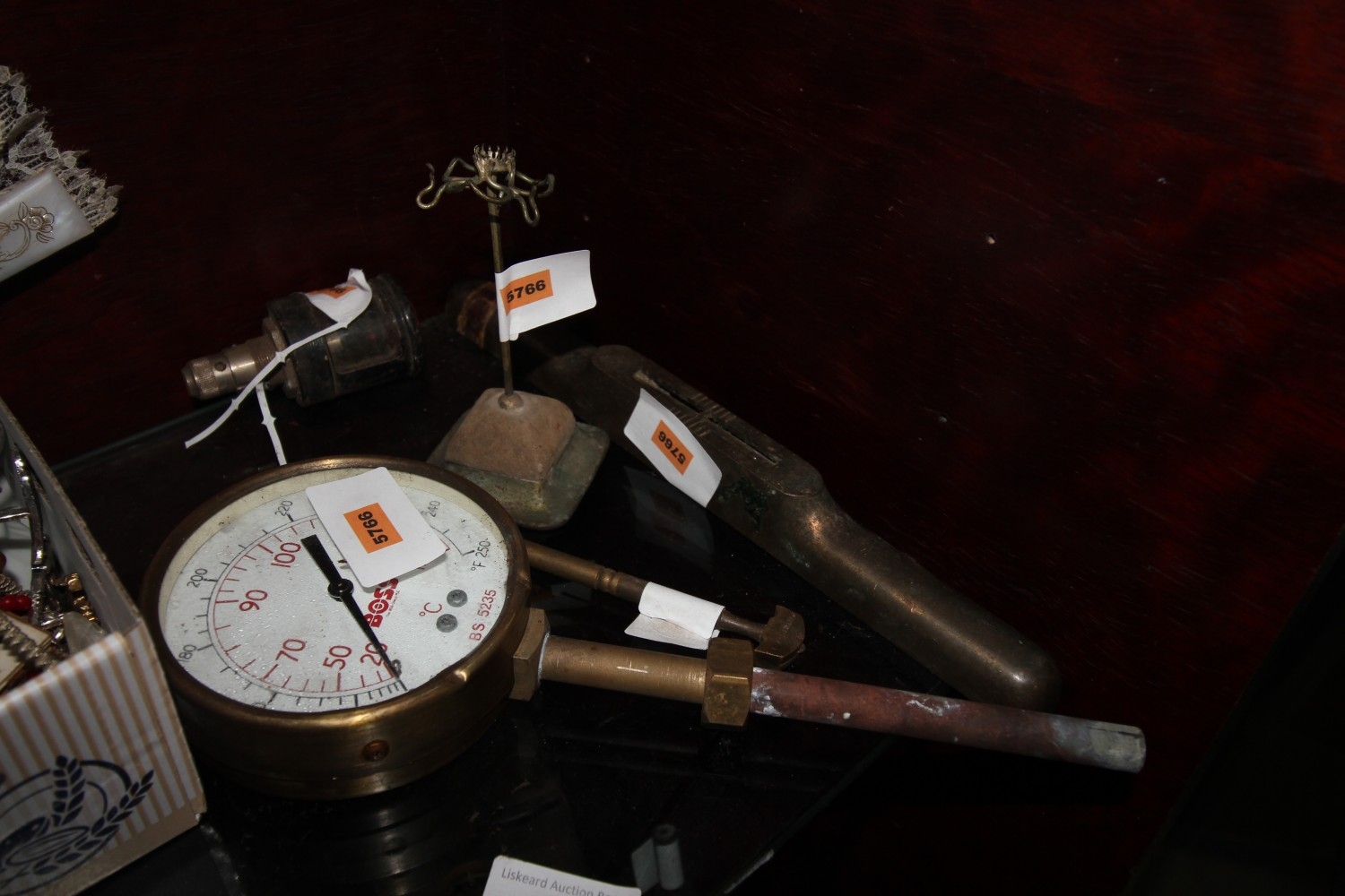 large qty vintage items inc brass spirit level, temperature gauge and more
