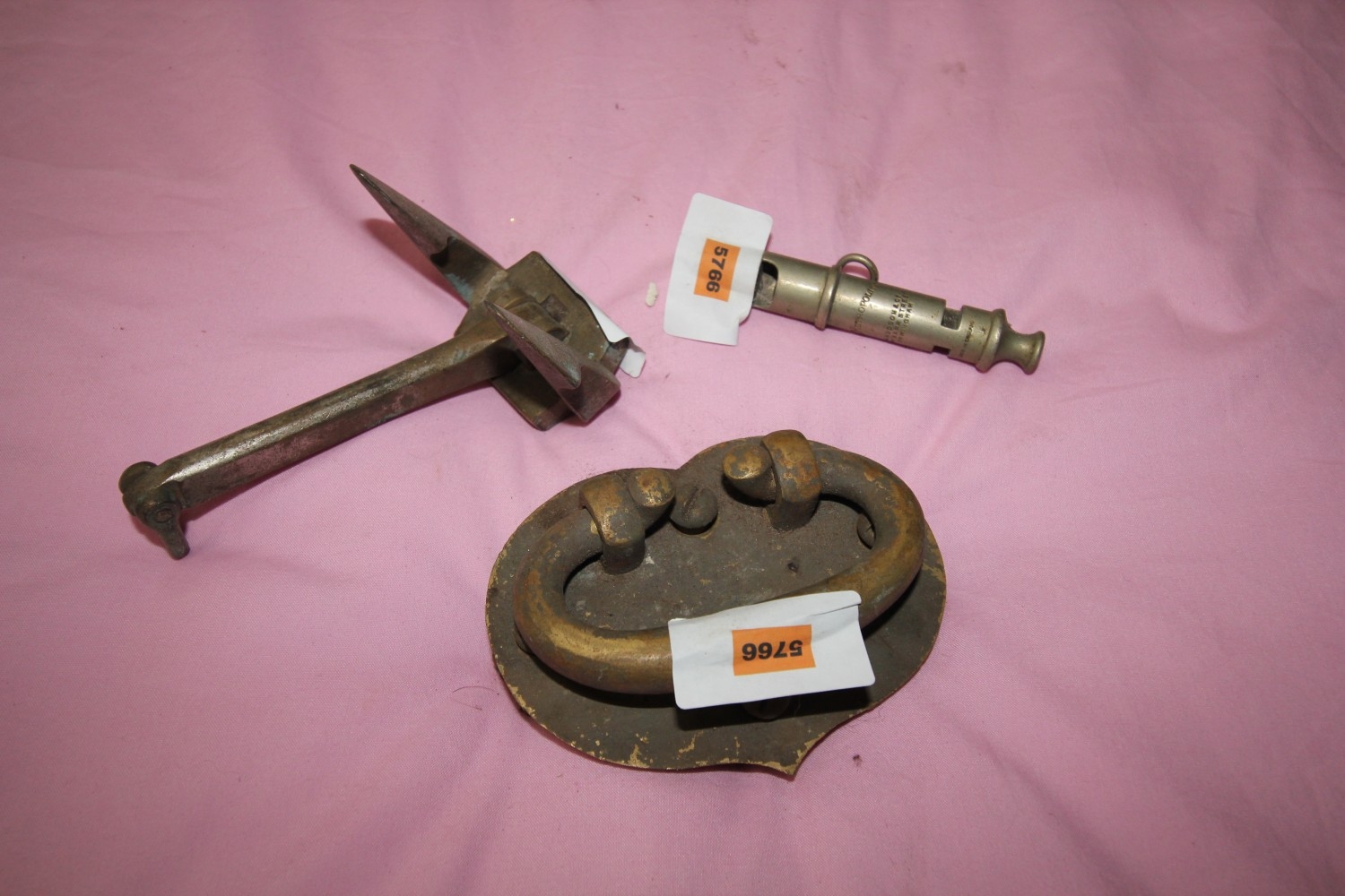 qty of vintage items inc whistle, door knocker etc