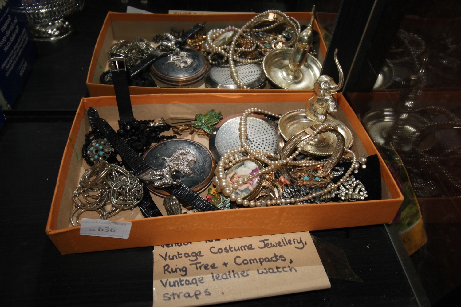 vintage costume jewellery, ring tree, compacts, vintage leather watch straps etc