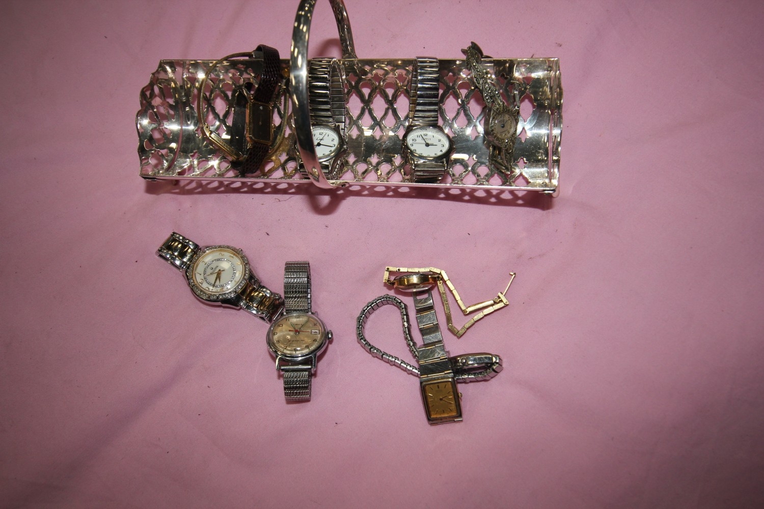 Lot 653: silver plated basket containing 10 watches inc bulova,...