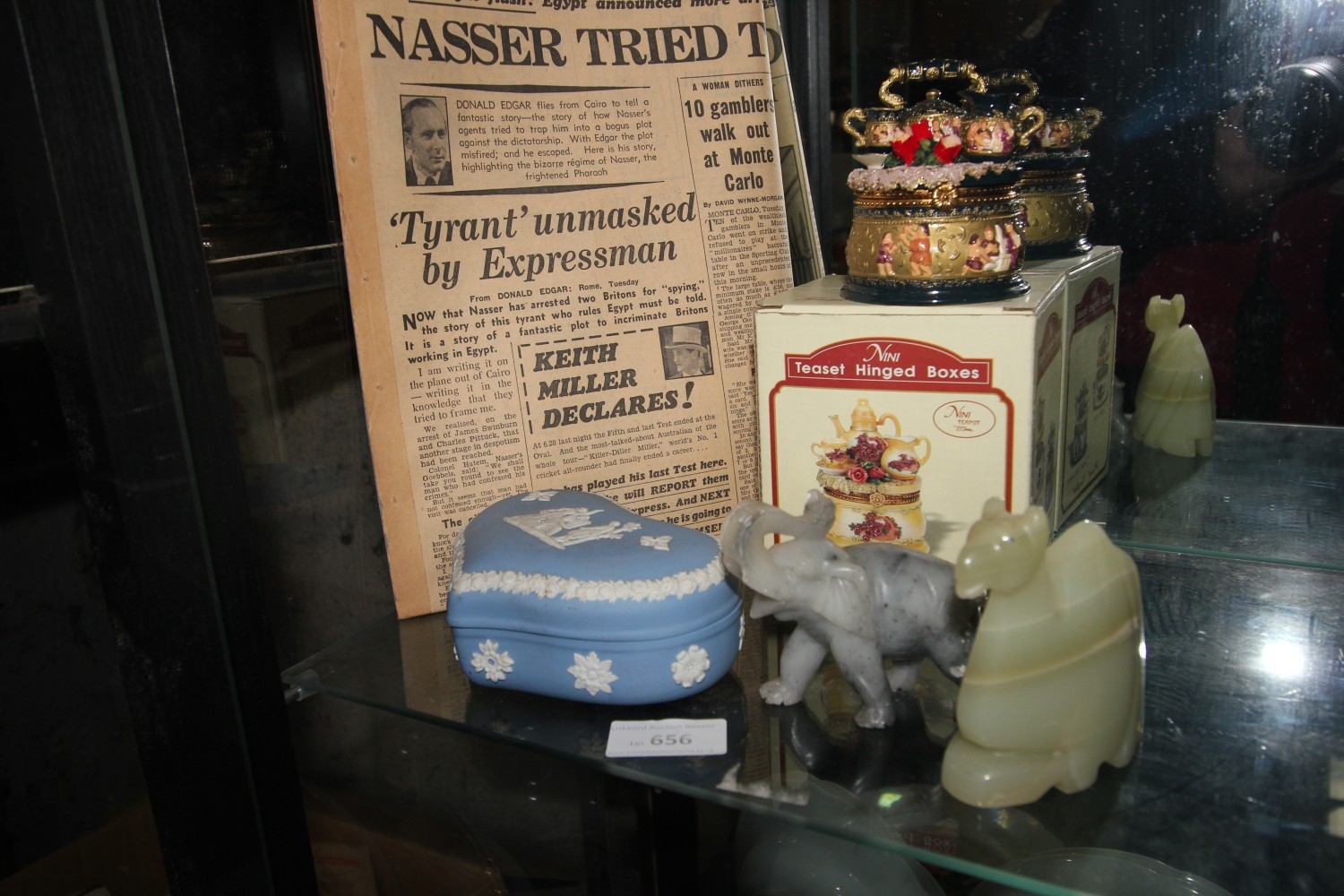 selection of polished stone / crystal camel and elephant plus wedgwood trinket dish, vintage 1956 newspaper etc