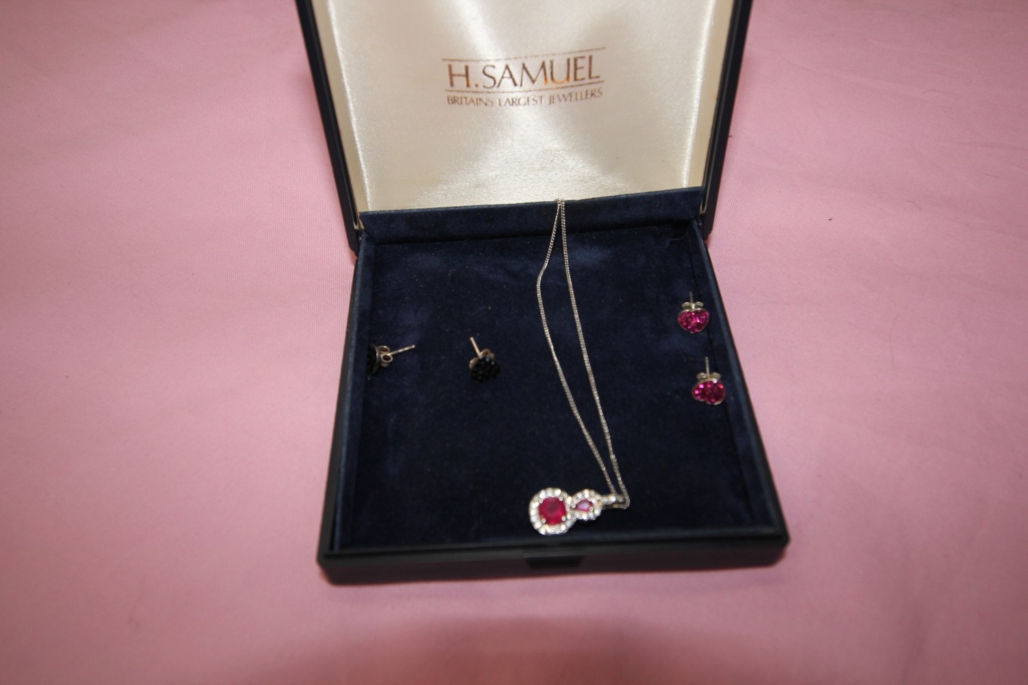 pair of solid silver pink gem heart earrings, black heart earrings and silver pink gemmed CZ necklace 4g