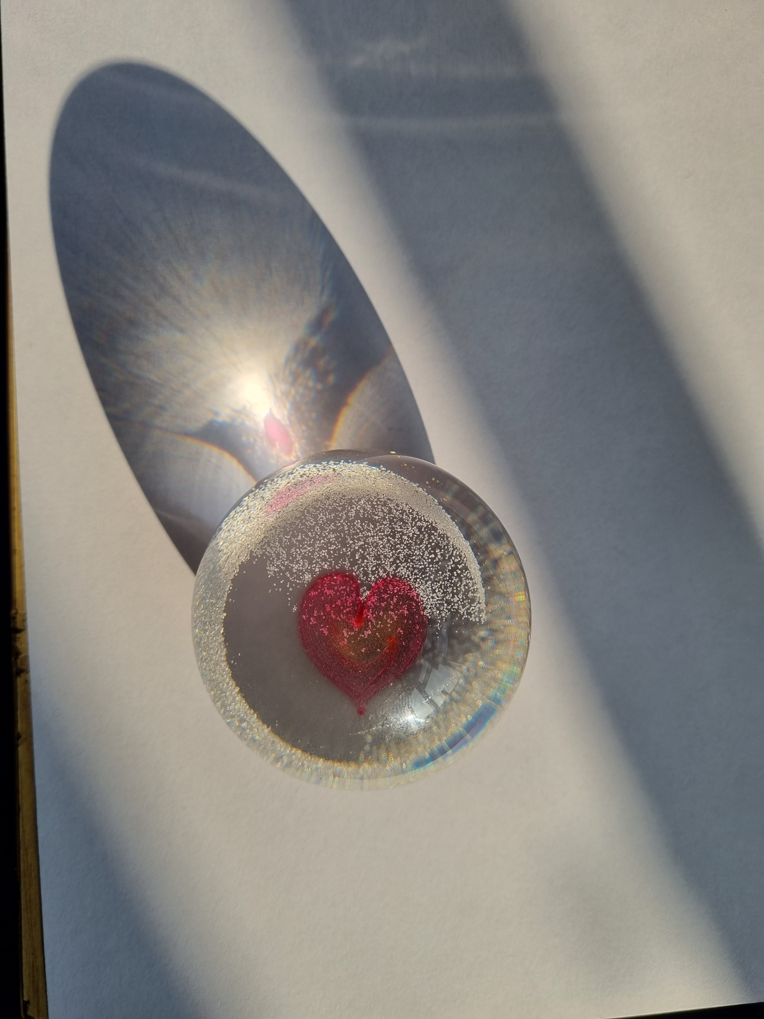 Caithness Glass of Scotland "Ruby Heart" paperweight, featuring a sculpted ruby-red heart suspended inside a clear glass dome surrounded by controlled bubbles.