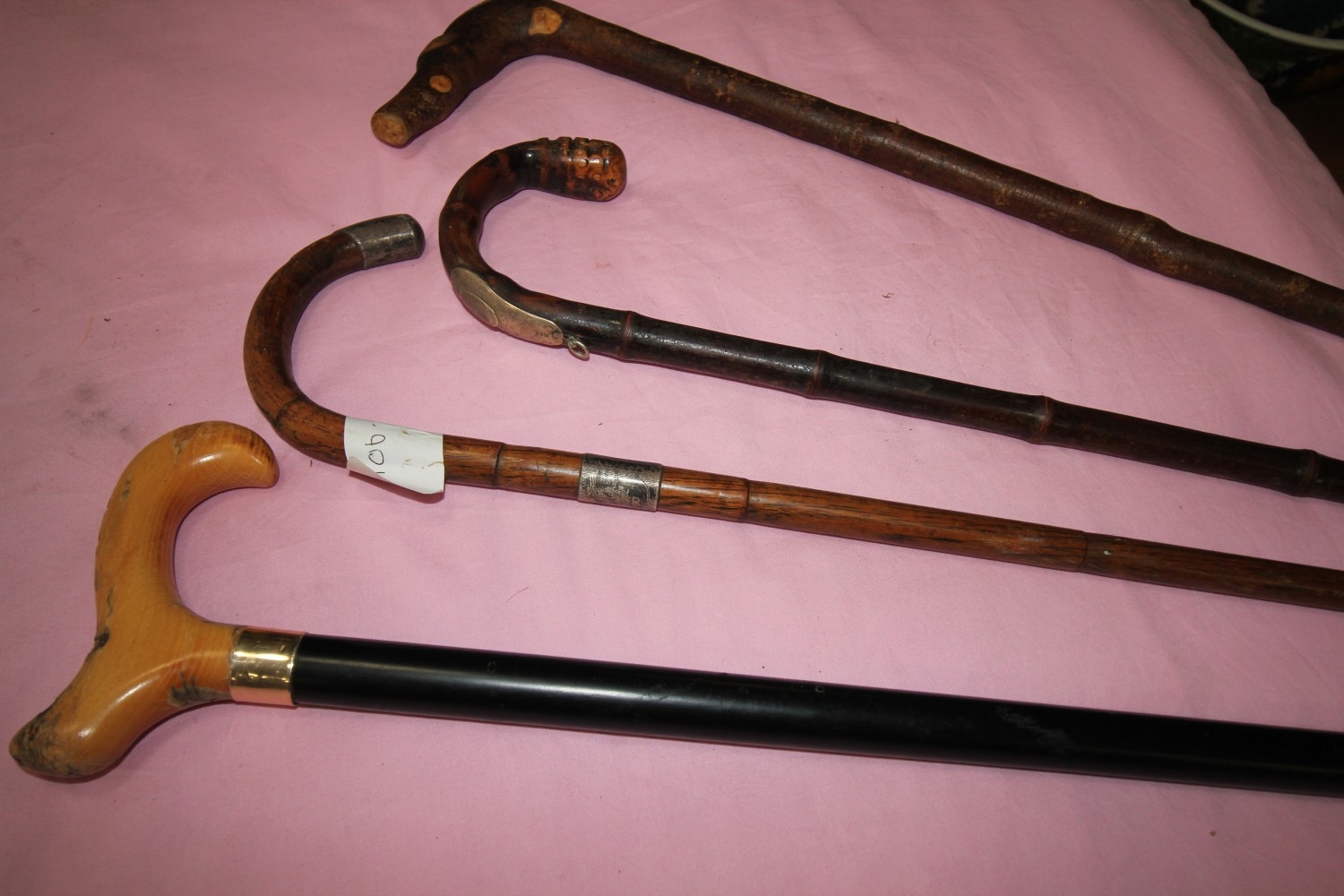 selection of 4 vintage carved walking sticks including Brigg walking cane with hallmarked malaca cain silver adornment, monogrammed silver collared and tipped cane dated 1921 plus two others
