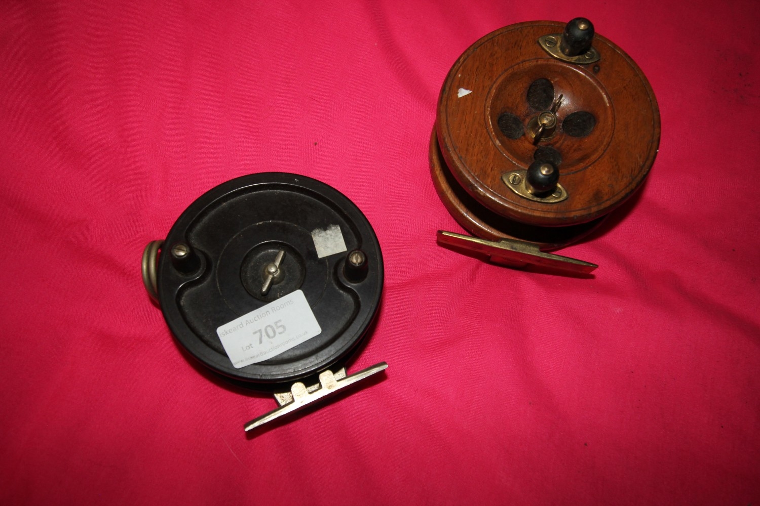 Allcock & Co. walnut and brass "Scarborough" reel circa 1930’s plus a Allcock Aerialite Bakelite fly reel