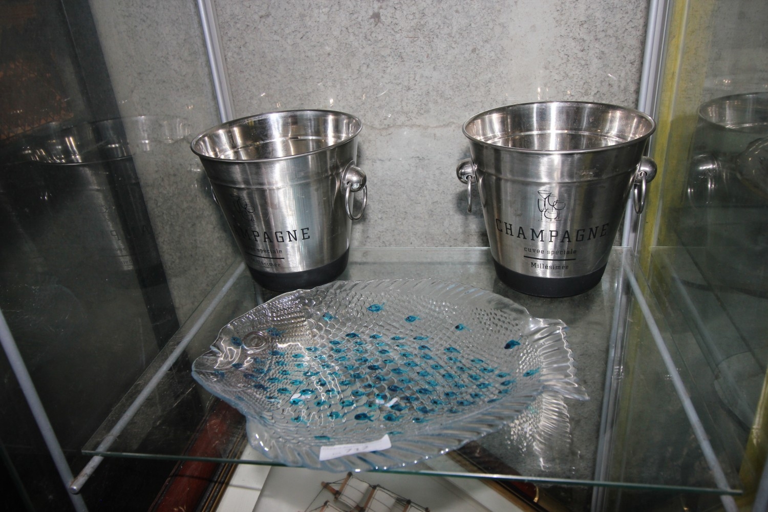 Lot 712: 2 champagne buckets and decorative glass fish trinket...