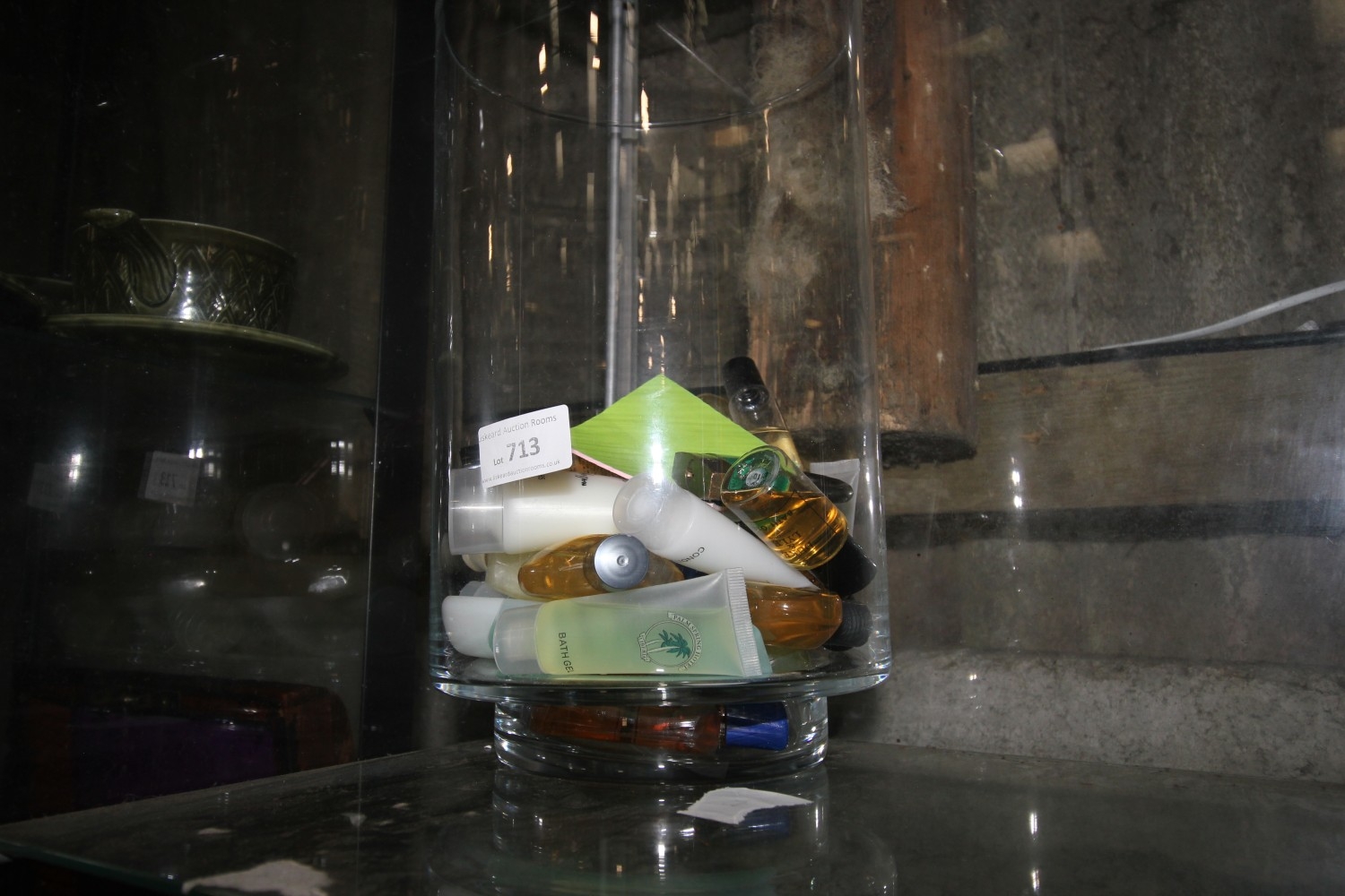 Lot 713: large glass vase full of assorted products and...