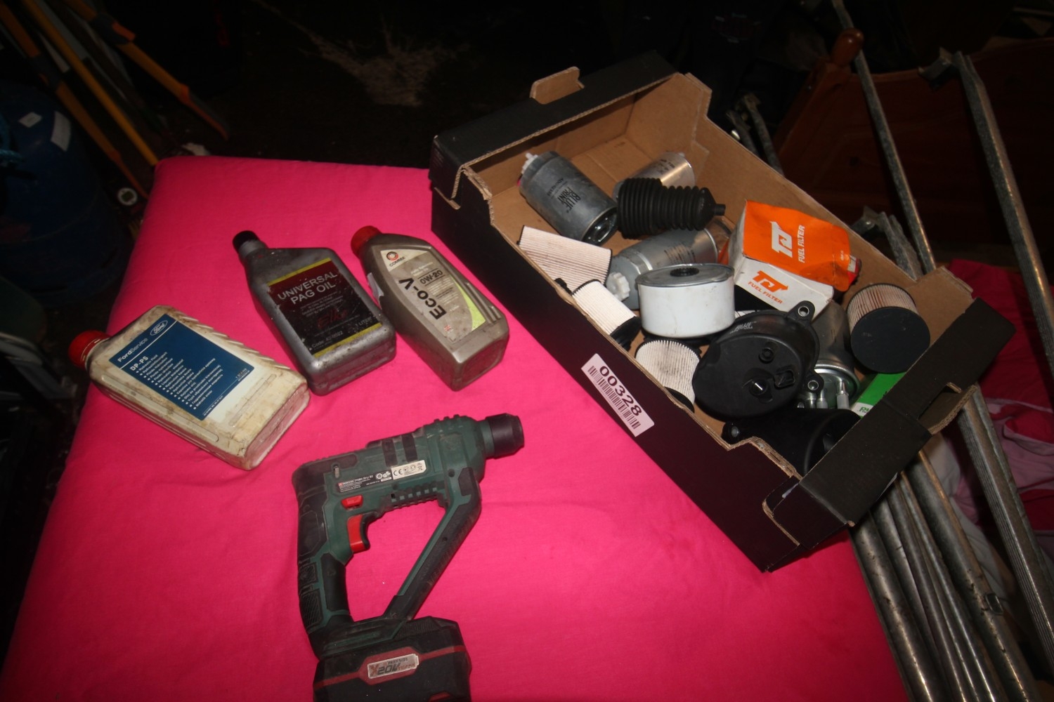a selection of motor oils inc universal pag oil dp-ps oil and 0w-20 oil plus mixed fuel filters and hammer drill