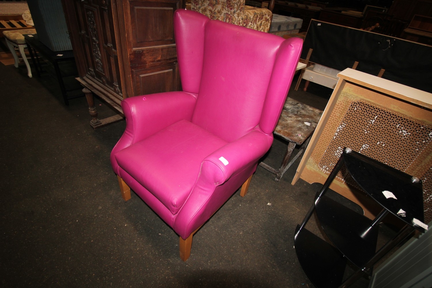 Lot 849: Vintage "Raspberry Crush" wingback high armed fireside chair...