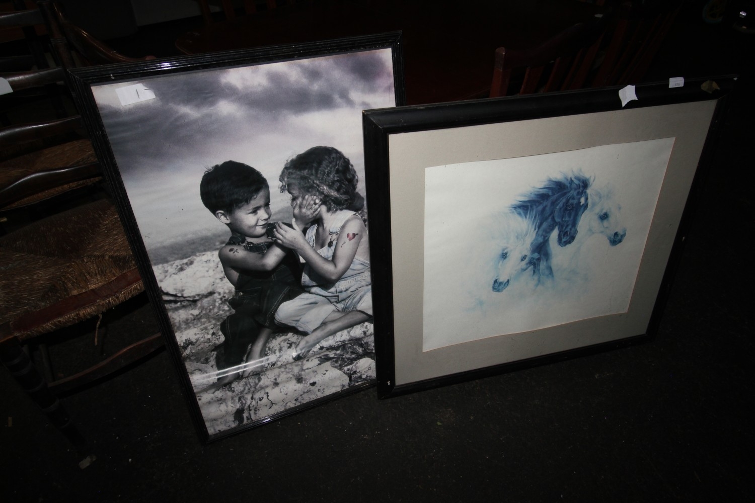 Two large framed prints: One of Three Horses by artist Nikki Trowers and the other of some naughty little boy slapping his sister