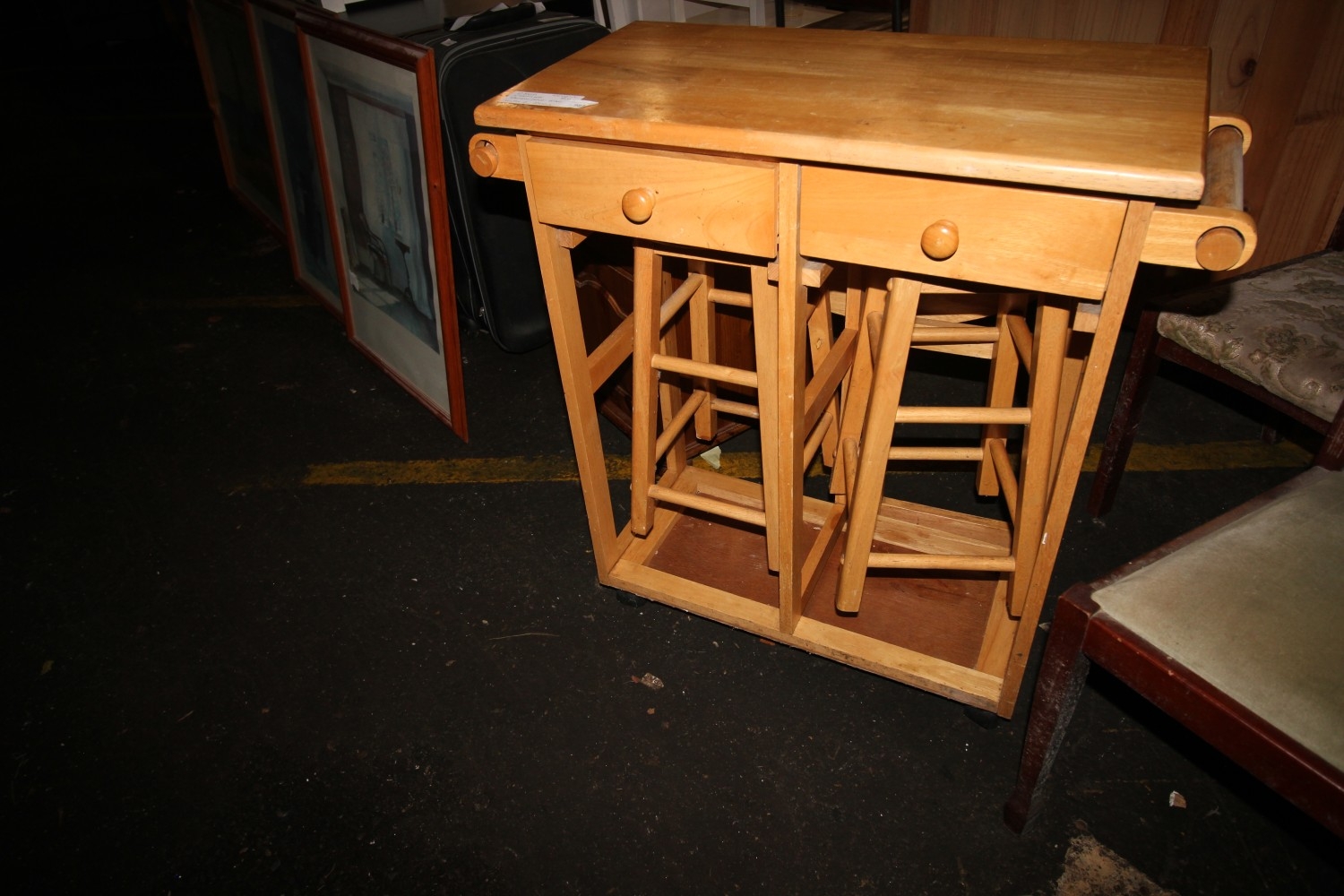 Solid wheeled beech two-drawer dropleaf breakfast bar with two on-board stools.