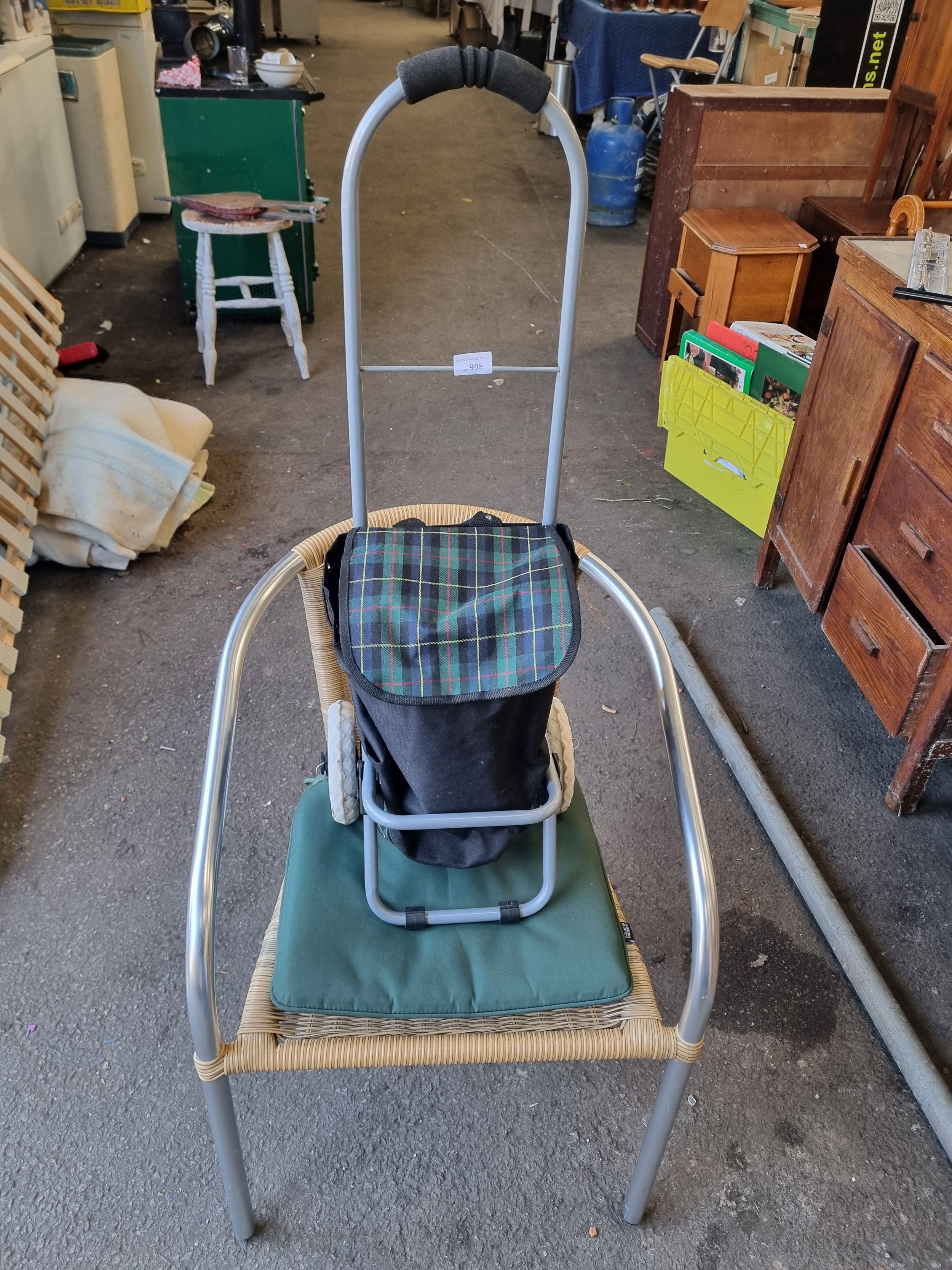 Selection of items inc. the folding lightweight tartan shopping trolley and a modern clean aluminium framed woven tub chair