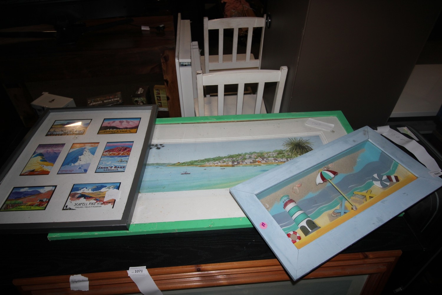 a 3d beach scene with a print of the sea side and a framed quantity of post cards