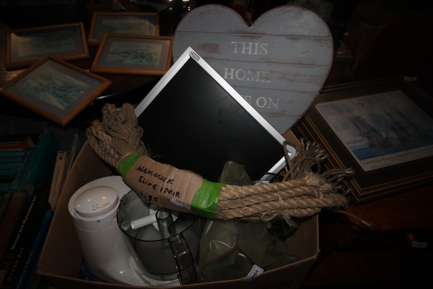 a box of misc inc a quantity of rope a keyboard a jucier/blender ect