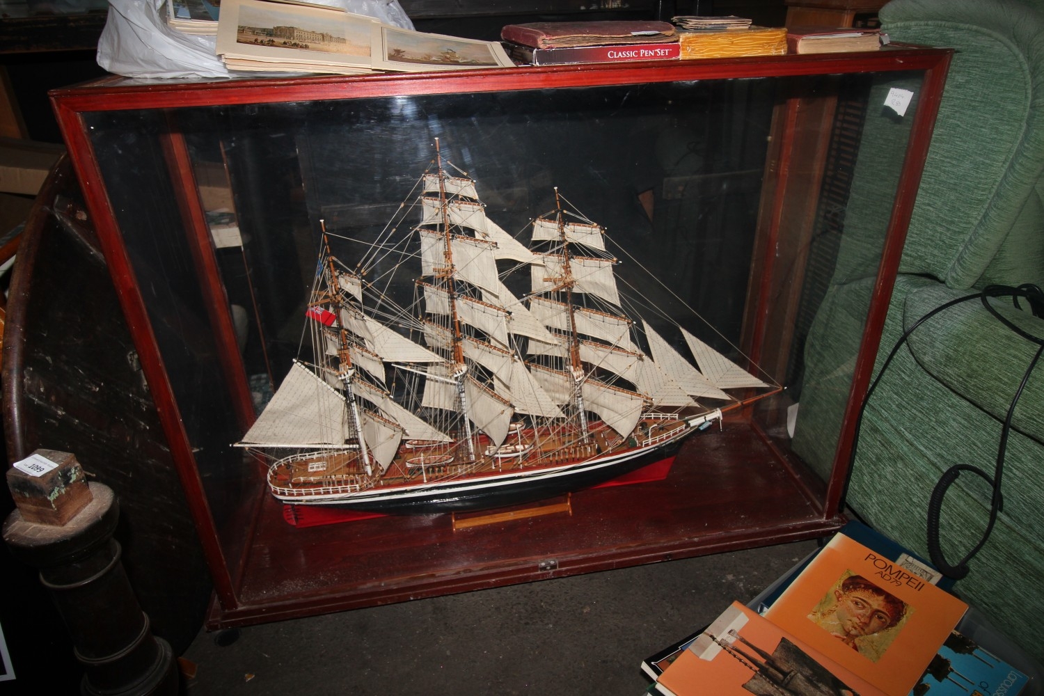 Large three-masted tall-ship displaying the Merchant Navy Red Ensign and house flag of Jock Willis (believed to be the cutty sark). Fully intact, lovely condition and in a protective case.