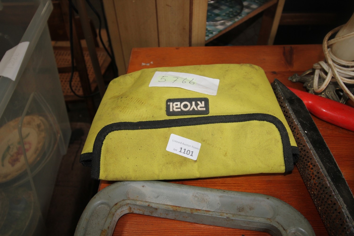 Lot 1101: Ryobi bagged electric screwdriver, G-clamp, rasp, alabaster lamp...