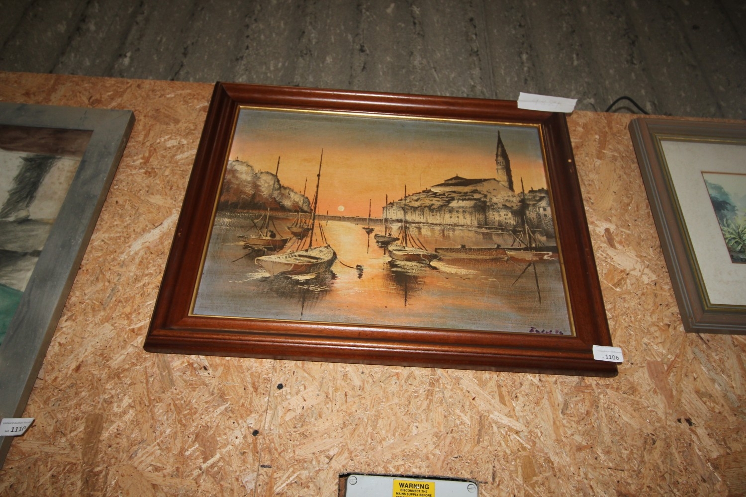 Vintage oil on canvas Mediterranean harbour scene at sunset – signed to bottom right